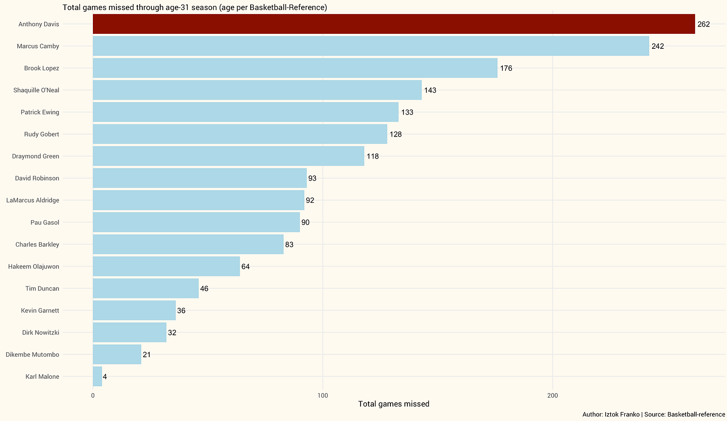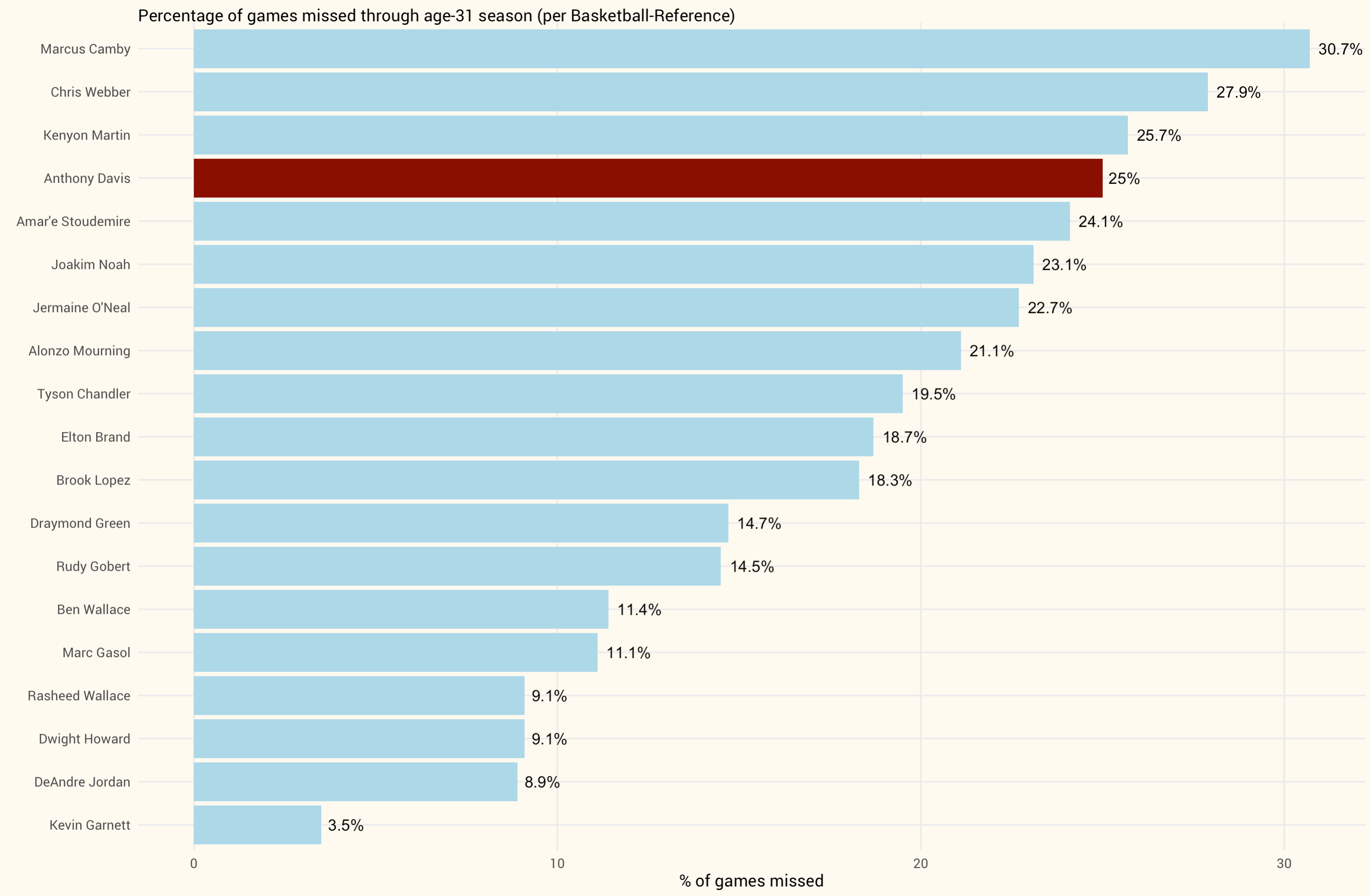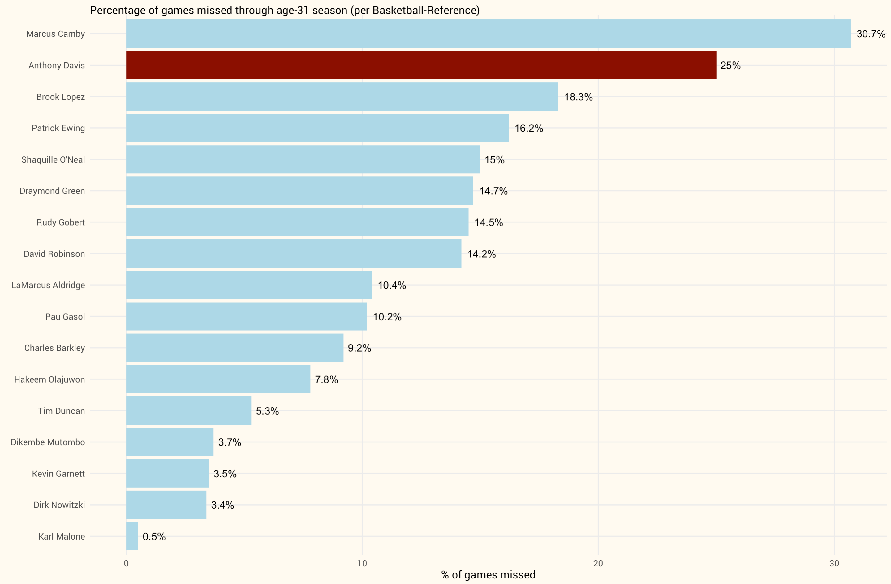 I also calculated the percentage of games missed to account for differences in entry age, with Davis entering the league at 19 compared to Duncan at 21, Camby at 22, and Ewing at 23.