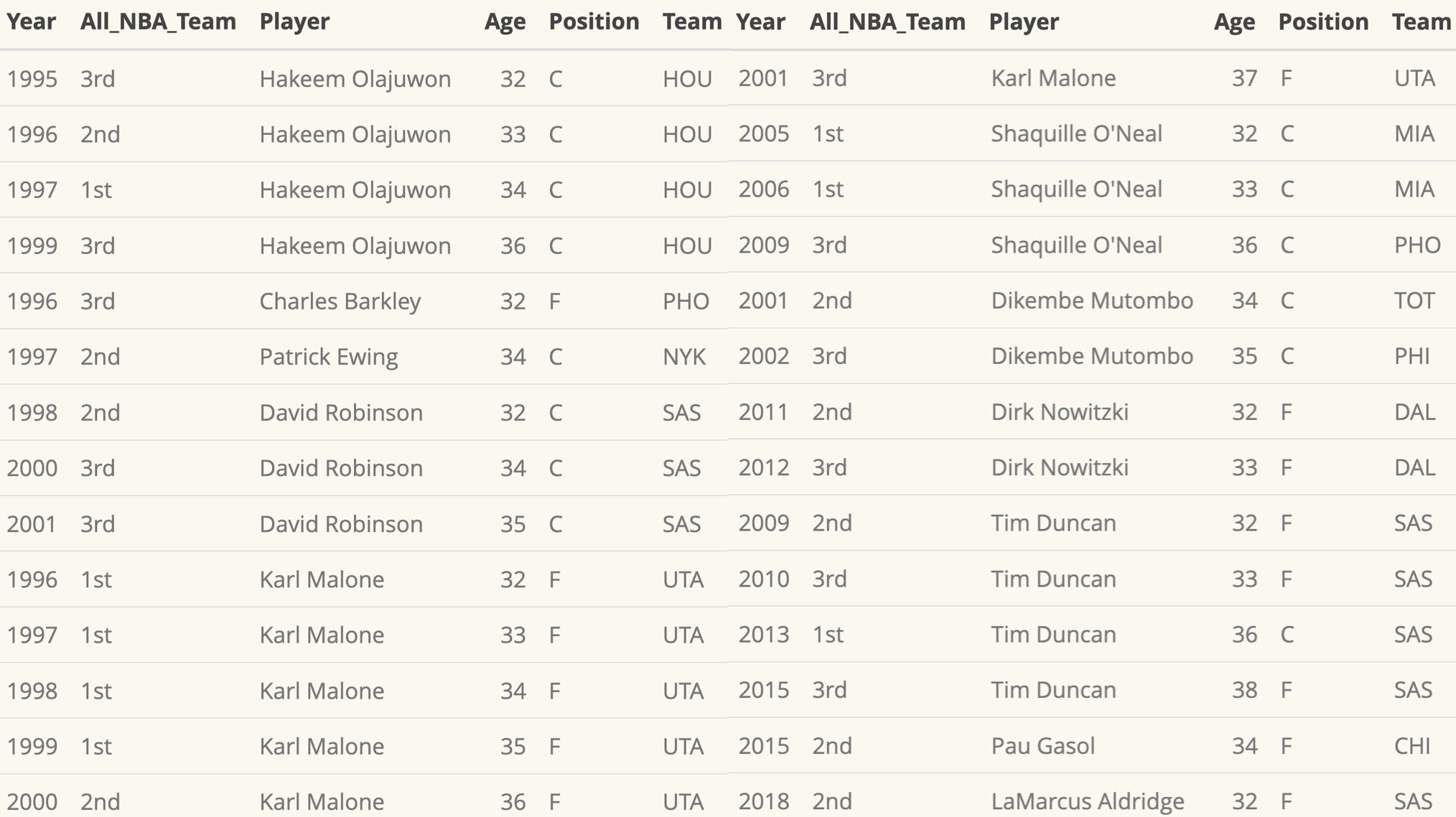 To find historical comps for Davis, players who earned an All-NBA spot past age 32, I narrowed the list to centers and power forwards only. I excluded the wing/forward hybrids like Dominique Wilkins, Dennis Rodman, Detlef Schrempf, Scottie Pippen, LeBron James, Jimmy Butler, DeMar DeRozan, Kevin Durant, and Kawhi Leonard, who spent more time between small forward and power forward rather than operating closer to the basket like Davis and other big men.