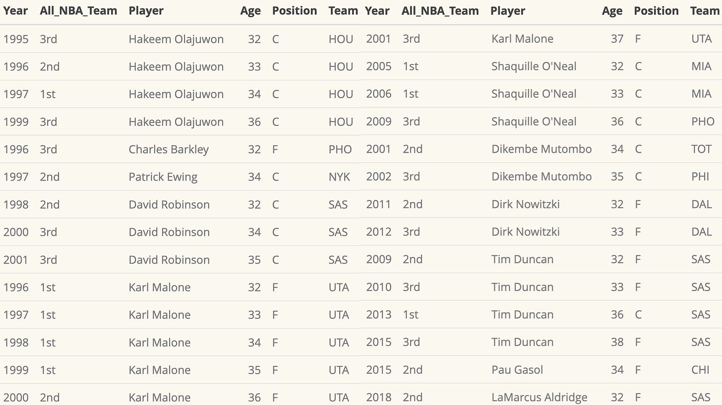 Basically, since 1994 only 11 big men have made an All-NBA team at age 32 or older. And if you look closer, most of those selections came in the 1990s and 2000s, before today’s faster, pace-and-space NBA, in an era dominated by physical bigs.