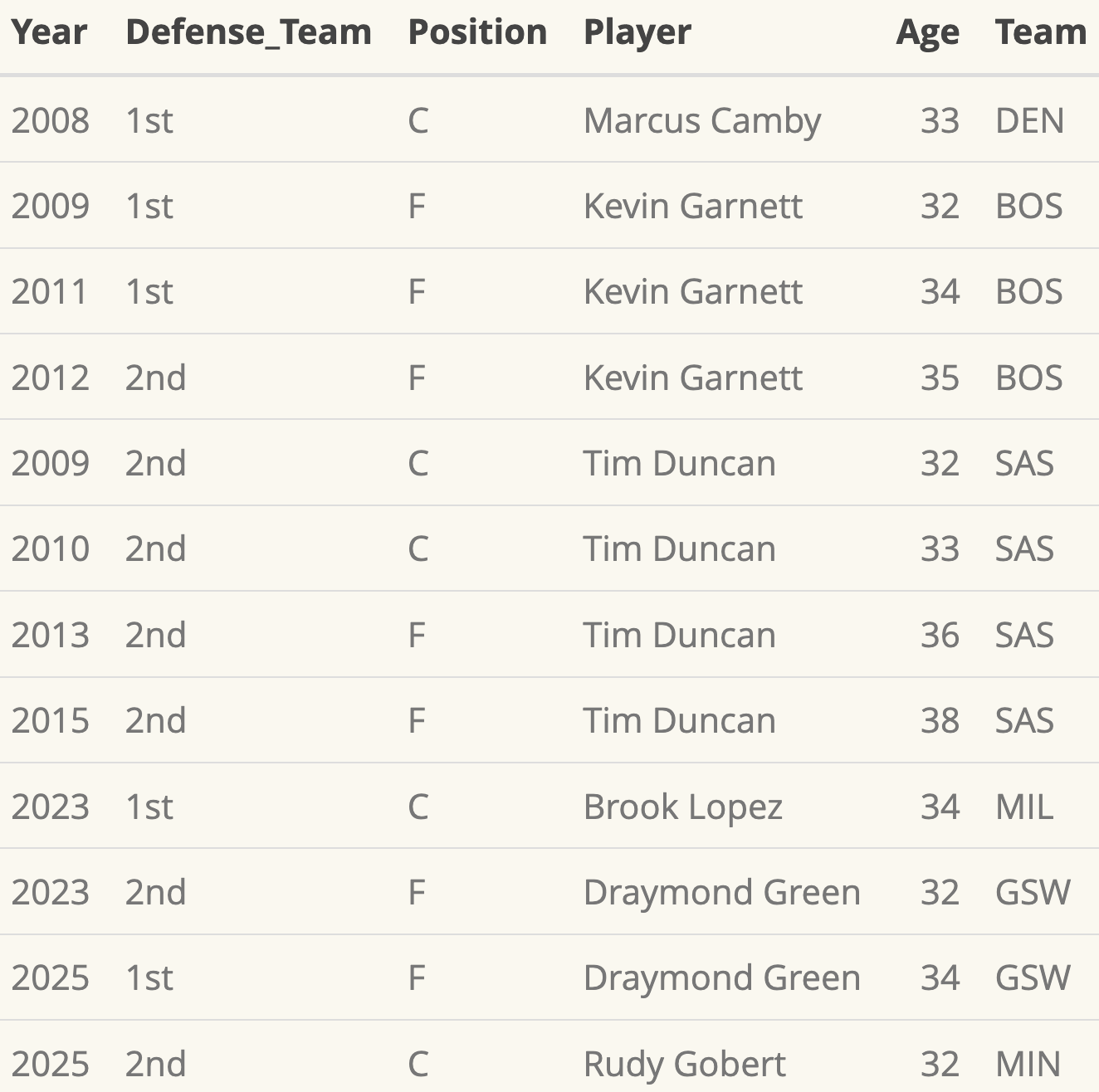 By expanding the scope to All-Defense teams, five more names join the list of players who had highly impactful seasons past age 32: Marcus Camby, Kevin Garnett, Brook Lopez, Draymond Green, and Rudy Gobert.