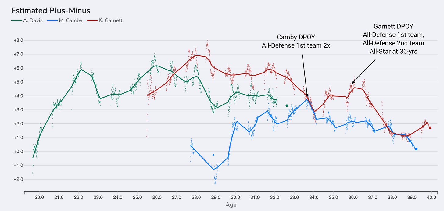 And once Irving hopefully returns to form and Flagg develops as a scorer and on-ball creator, the smarter long-term path for Davis and the Mavericks may be for him to lean fully into being the defensive anchor rather than the offensive focal point. It’s a transformation Kevin Garnett made on a similarly stacked Celtics team in his mid-thirties. Garnett, like Camby, found success in that role, earning All-Defense First and Second Team honors at ages 34 and 35, and prolonging his high-impact play well into his late 30s.