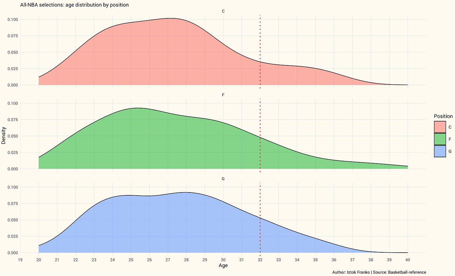 The next step in my analysis was to see if All-NBA selections differ by position, with the goal of narrowing down the research to big men more comparable to Davis. And the results do show a difference: the age distribution curve for centers signals they tend to peak earlier than, say, smaller guards.