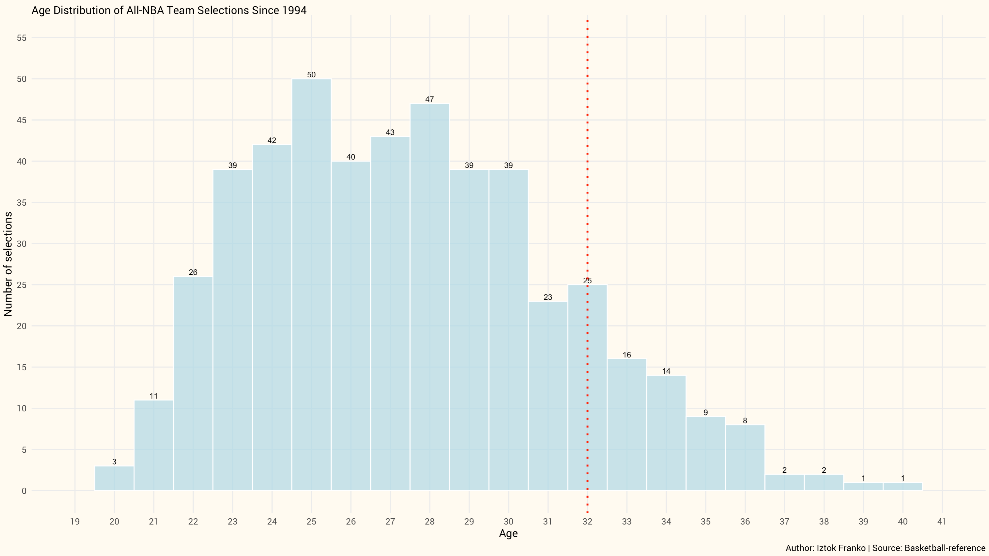 Only 78 of the total 480 spots, just 16 percent, went to players who started the season at age 32 or older. Since 1994, there have been only 36 such players, a list dominated by LeBron James (9 selections after age 32), Karl Malone (6), and Steph Curry (5).