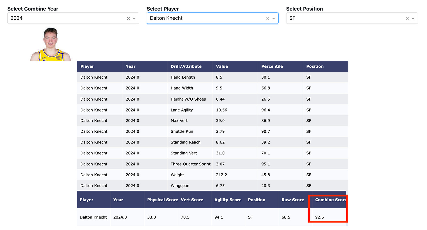 When I followed up with Nick about why Knecht ranked so high in the Combine Score, he explained that Knecht recorded a four-inch higher vertical jump than Flagg and posted agility numbers that were off the charts.