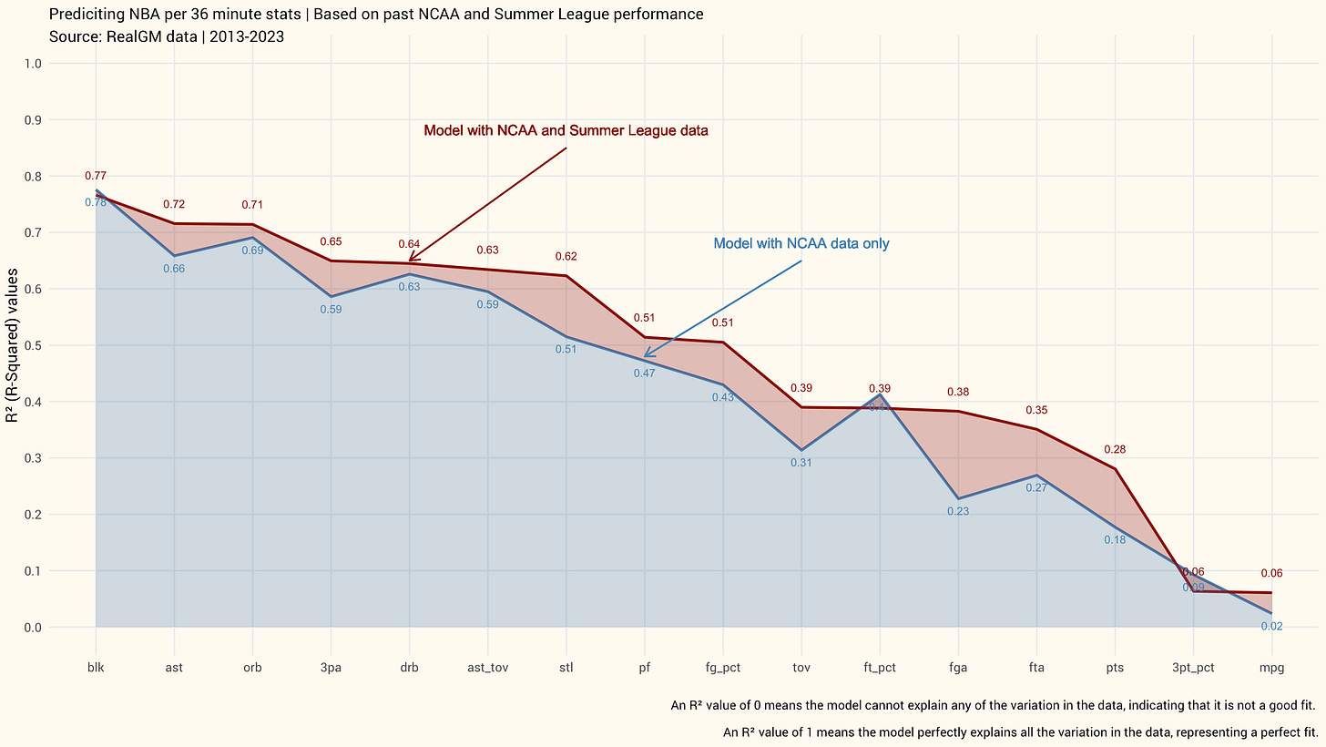 And while we don’t have Summer League data yet for the 2025 Draft class (represented by the red line in the chart), my 2023 model showed that Summer League adds a valuable extra sample to the projection, but it’s not essential. The overall results remained very similar to the version based on NCAA data alone (shown by the blue line).