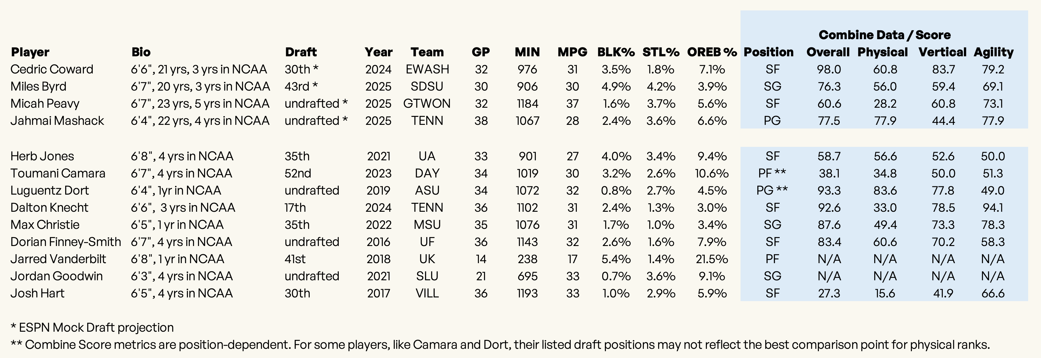 Why am I sharing this again? Because I used the same approach and key stats (block rate, steal rate, and offensive rebound rate) to build comparisons for the players Nick highlighted when I asked about prospects who fit the exceptional athlete archetype. We also took it a step further by including Nick’s Combine Score metric, which adds another valuable layer of insight into each player’s athletic profile and physical tools.