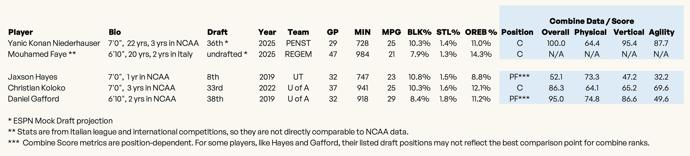 Givony praised Niederhauser’s physical tools on display at the NBA Draft Combine and the Excel Pro Day. Interestingly, the two player comparisons listed for the Swiss big man on NBADraft.net are both names Lakers fans will recognize: Jaxson Hayes and Daniel Gafford. Another comparison I included in my table, for obvious reasons, is Christian Koloko.