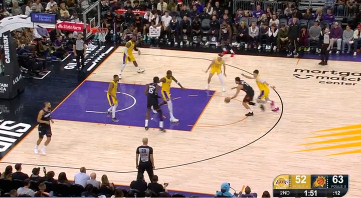 The Suns are far more comfortable and disruptive executing their base pick-and-roll defensive scheme. They build a tight pocket around the ball handler through aggressive shrinking and gap help, with Mark Williams anchoring the back line. By contrast, the Lakers repeatedly gave up switches that allowed Devin Booker and Dillon Brooks to attack smaller defenders like Austin Reaves and Nick Smith Jr., holding them hostage (literally with hostage dribbles) often with little to no help.