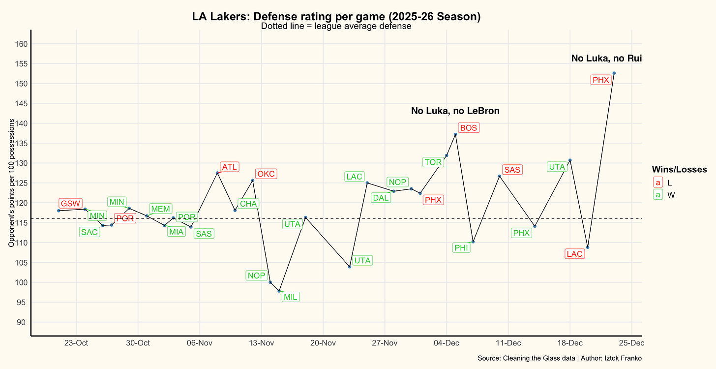 The Lakers gave up an astonishing 152.6 points per 100 possessions in non-garbage-time minutes, dropping them to 25th in the league in defensive rating, ahead of only five bottom-feeder teams.