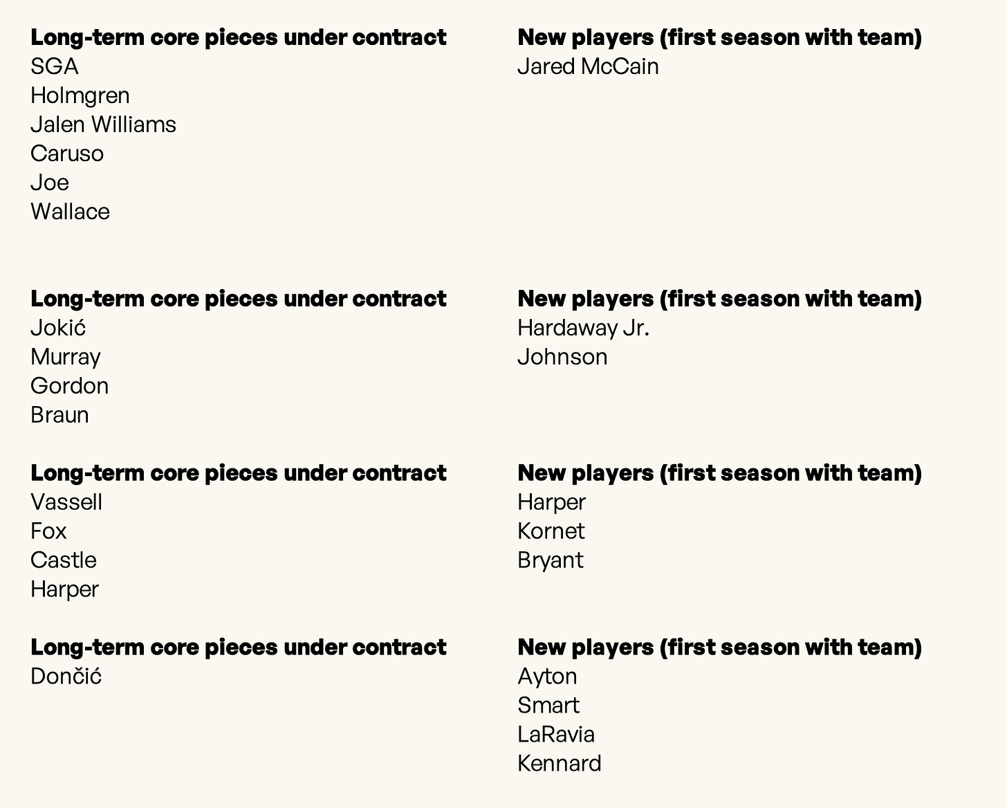 Dončić and the Lakers are the clear anomaly, a team where, besides Dončić, no other key player has a contract or clarity for next season. One could say Austin Reaves is the only long-term piece next to Dončić on the roster, but even he is an upcoming free agent, with all the uncertainty that comes with that.