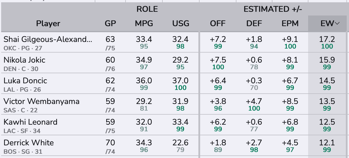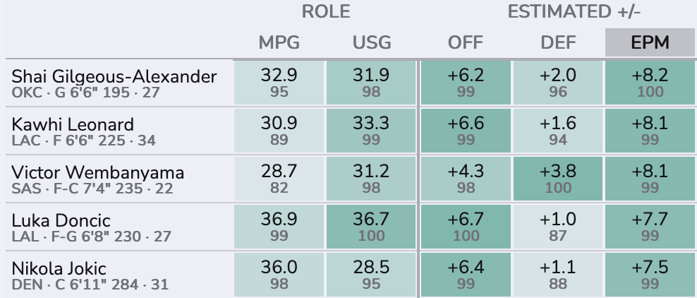While I don’t think it’s a coincidence that Gilgeous-Alexander, Jokić, and Wembanyama stand out in per-100-possession impact metrics, I do believe there is a lineup boost from continuity, and even more from playing a vast majority of minutes in good to great, balanced lineups.