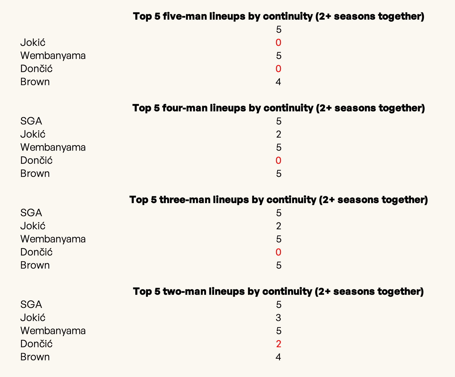 If we add the continuity aspect to it, you can see how Dončić and the Lakers had a lot of figuring out to do earlier in the season. Below are the top five five-, four-, three-, and two-man lineups by continuity for the top MVP candidates. As you can see, all of the top five most-used permutations of Dončić’s five-, four-, or three-man units include at least one, if not more, players who joined the team last summer.