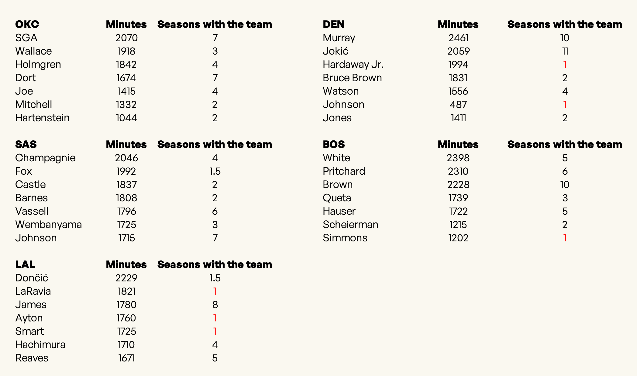 Nikola Jokić: his 11th season in Denver and his 10th playing with the second-best player, Jamal Murray. They waited patiently to find the optimal role player next to the star duo, and Aaron Gordon has been that piece for six years now. Christian Braun is in his fourth season in Denver. They added three new players this season in Cameron Johnson, Tim Hardaway Jr., and Jonas Valančiūnas (I’m not counting Bruce Brown, who returned), and had a lot of injury absences to navigate. However, Jokić and Murray are top two on the team in total minutes, and they are the infrastructure and the system on their own. The duo has more than 16,000 minutes together on the floor under their belt and are the modern version of John Stockton and Karl Malone when it comes to familiarity and continuity.