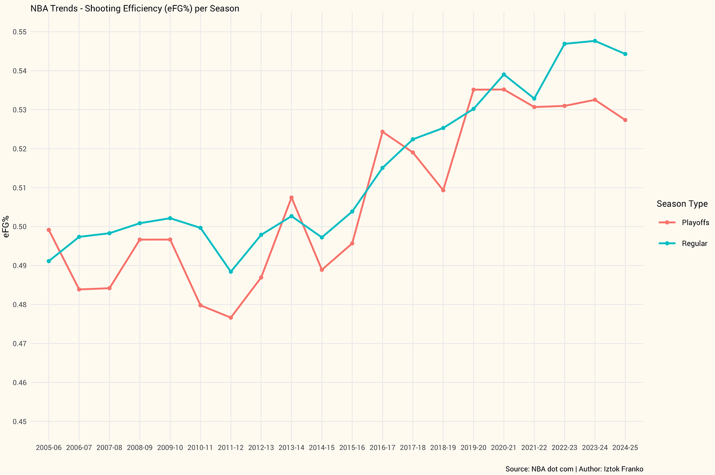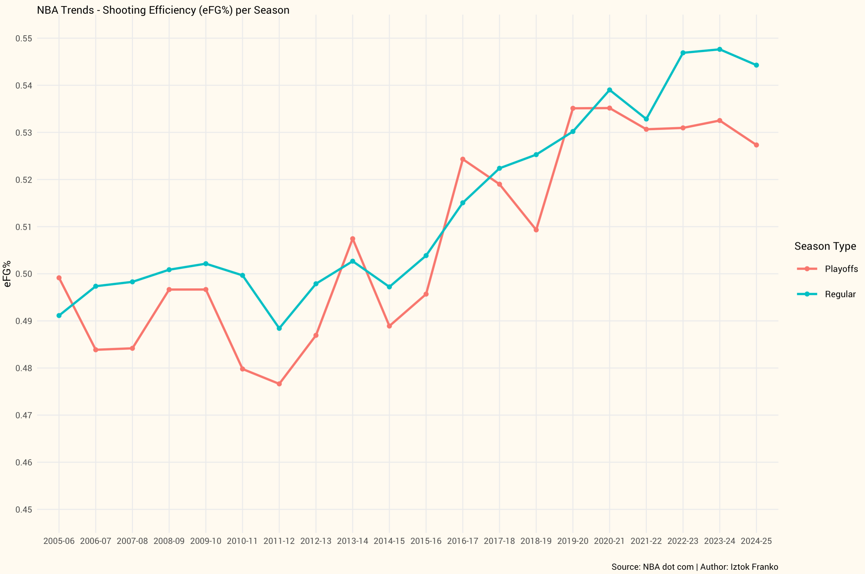 Second, shooting efficiency tends to drop in the postseason due to the more physical play allowed, as well as the increased preparation and attention to detail from opposing defenses. With the rise in physicality, which I covered in the first part of this series, this season marked the first time we have seen overall effective field goal percentage decline after years of steady growth.