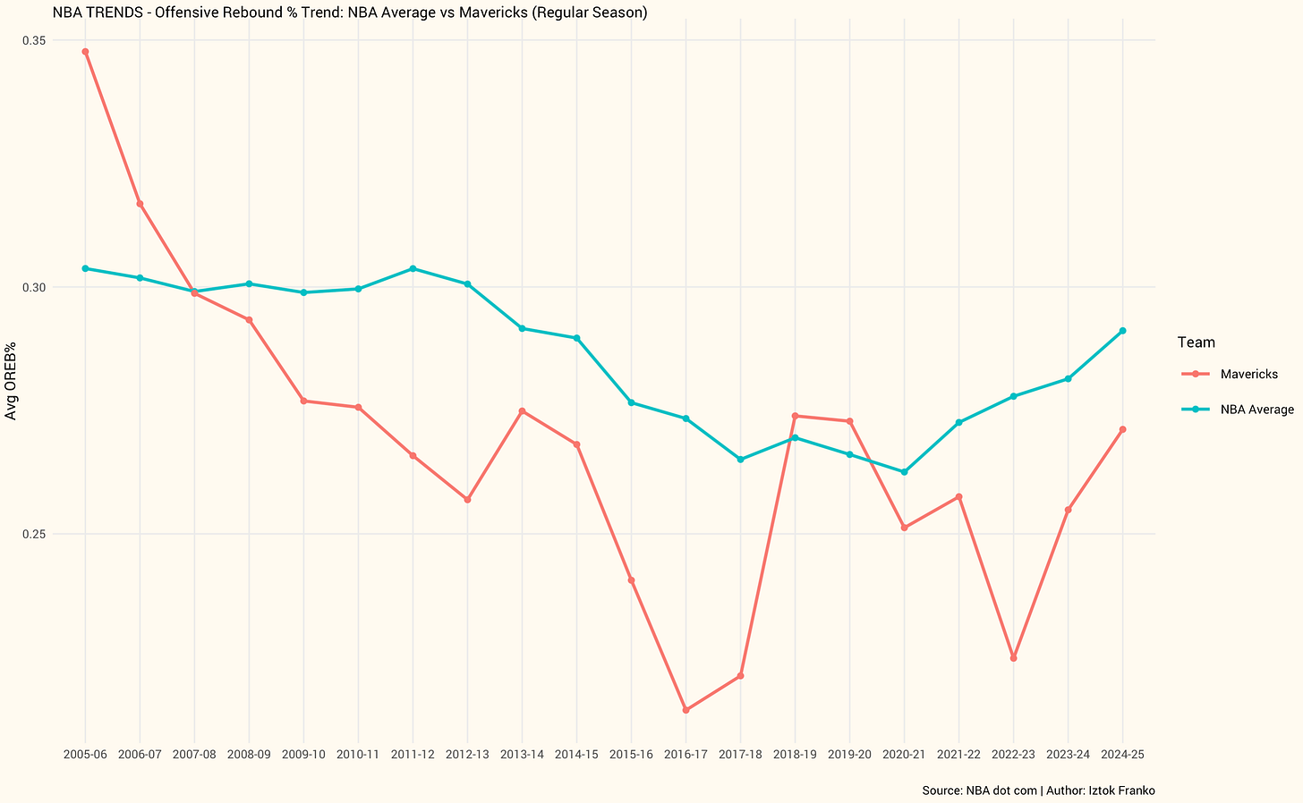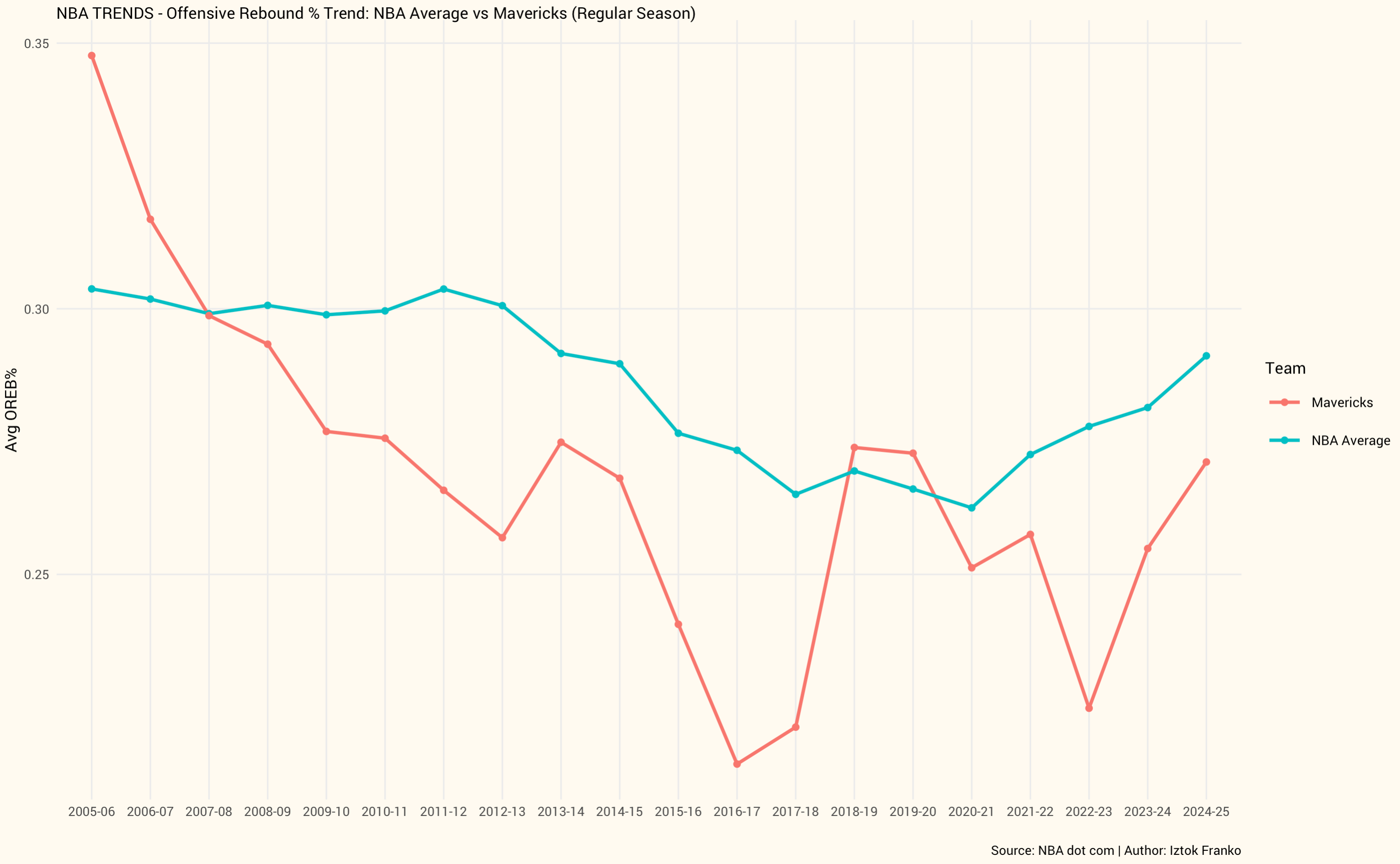 The Mavericks have been even less committed to crashing the offensive glass than the Lakers. Aside from two exceptions in 2018–19 and 2019–20, when they finished 12th and 15th, they have consistently ranked in the bottom ten and often in the bottom five in offensive rebounding for more than 15 years.