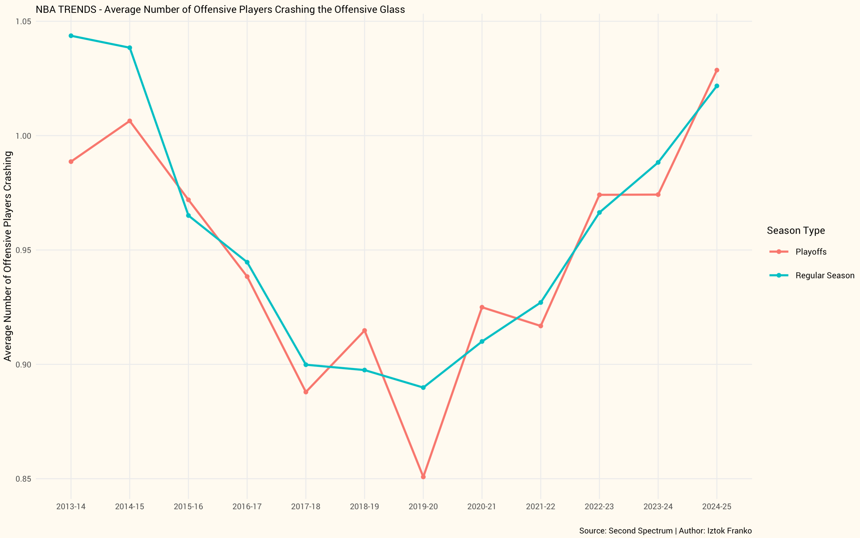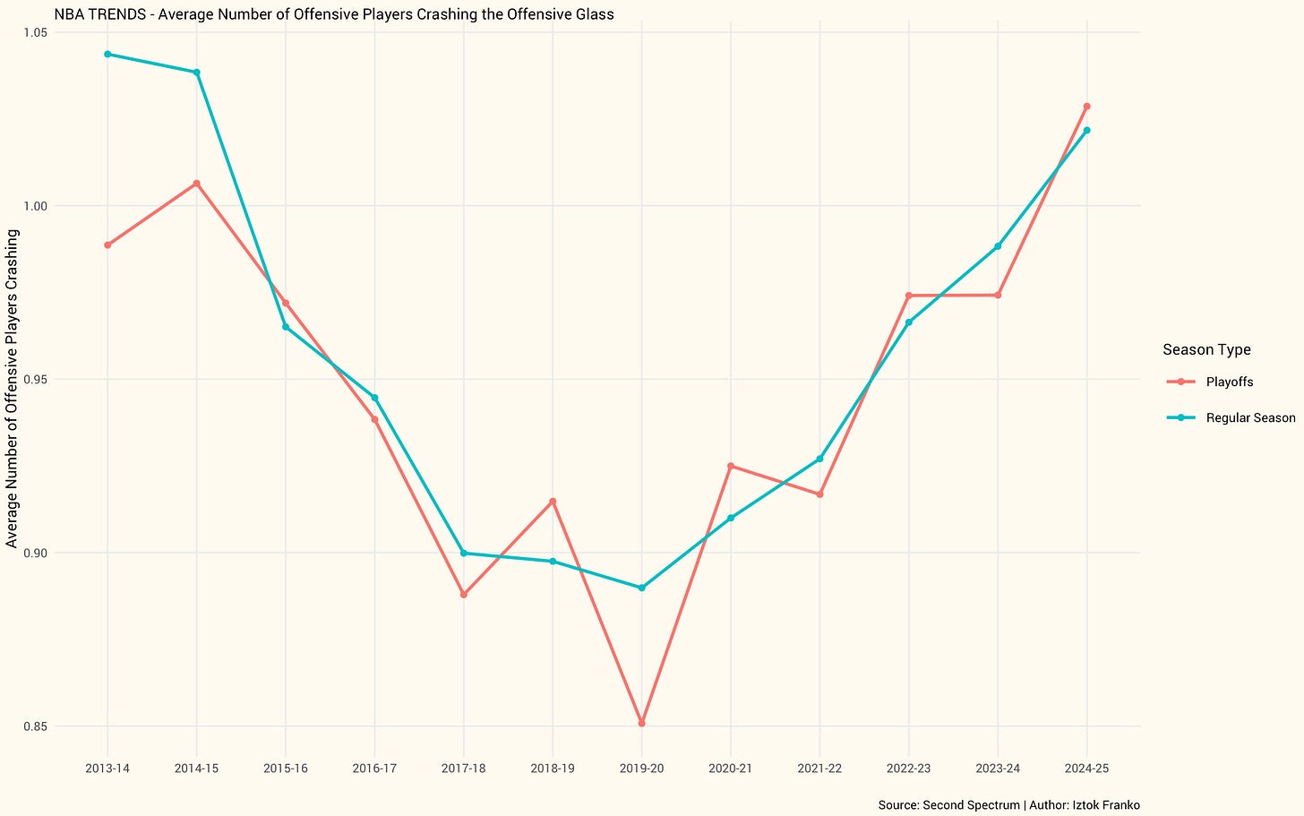 After years of teams taking a more conservative approach to crashing the offensive glass and prioritizing transition defense, there has been a clear shift. Following nearly a decade of decline in offensive rebounding rates between 2010 and 2020, the numbers have steadily climbed in recent seasons. This year, the offensive rebounding rate reached its highest mark in the past ten years. It is not a brand-new trend. A lot has already been written about why offensive rebounding has come back in style, and I will revisit some of that strategic thinking in later sections.