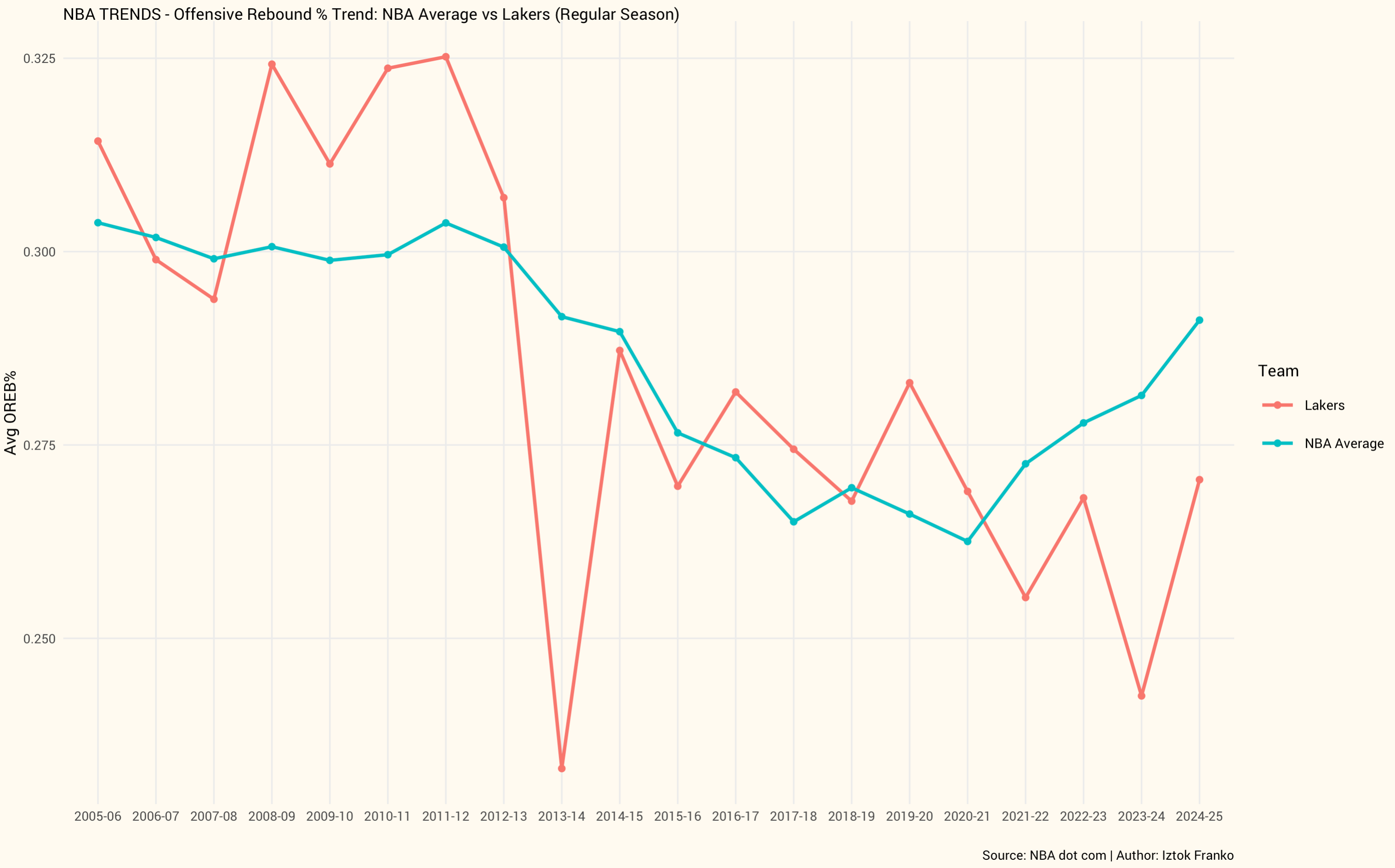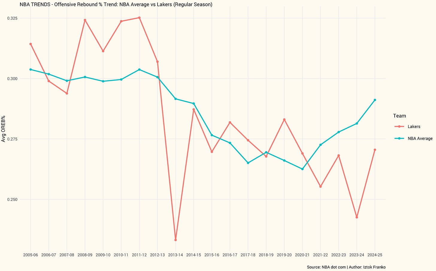 Redick noted that the Lakers finished 29th, or second worst, in offensive rebounding during the 2023–24 season. Despite his focus on the issue, they still ended up in the bottom third of the league this season, ranking 23rd. The team went through a major transformation midseason and gave up size by swapping Anthony Davis for Luka Dončić. However, they were actually worse before the trade, ranking 25th in offensive rebounding. In fact, the Lakers have ranked in the bottom ten in offensive rebounding in each of the last four seasons.